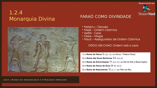 A ideologia faraônica se baseava na dualidade entre Maat (ordem cósmica) e Isefet (caos). O faraó, como representante de Maat, tinha a missão de combater o caos e garantir a harmonia do universo. A manutenção da ordem se refletia na justiça social, na prosperidade econômica e na estabilidade política.