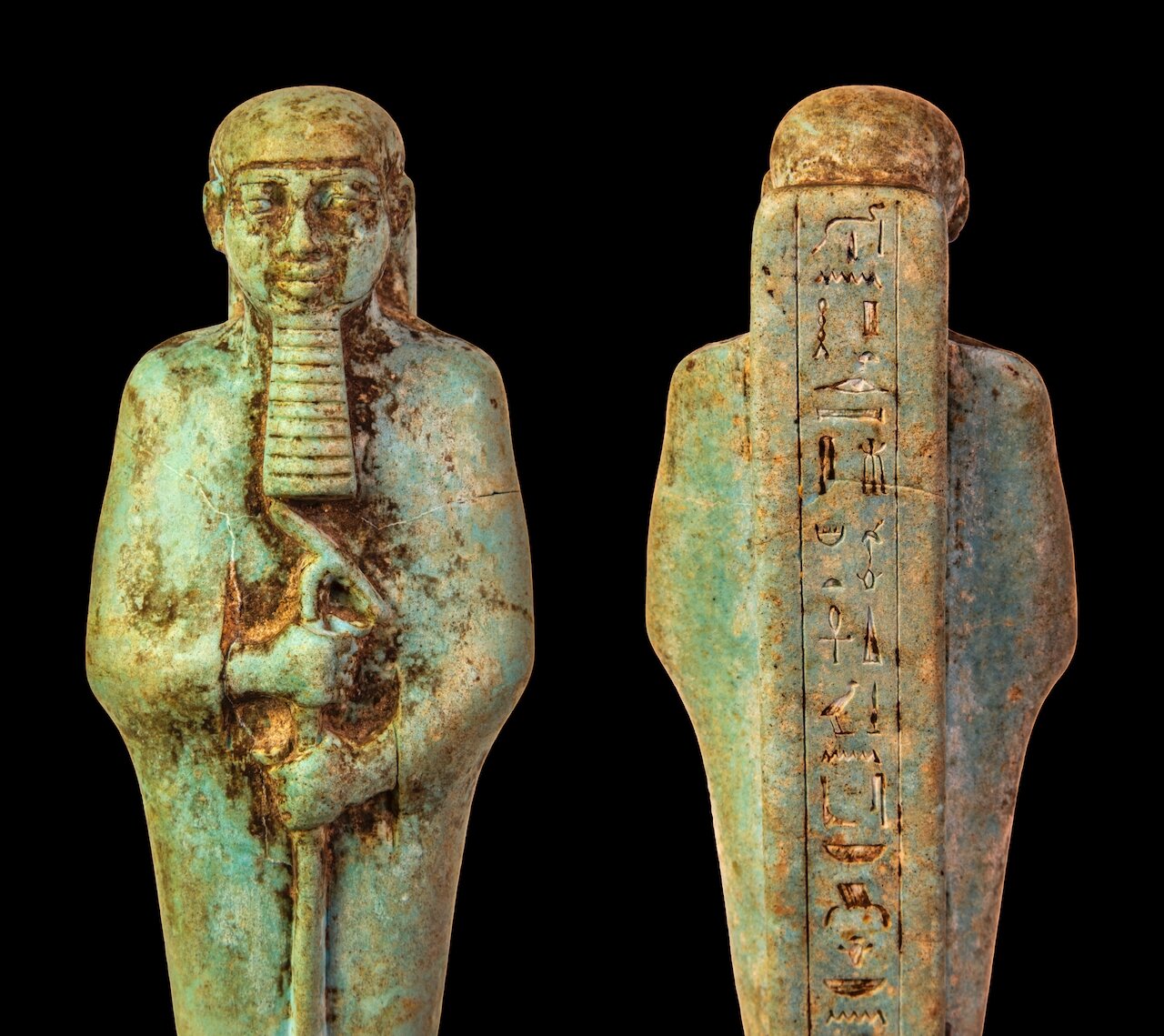 Na única coluna de texto no verso desta estatueta de faiança de Ptah, o deus é reconhecido como um deus criador e referido como “aquele que fez o céu e deu origem ao artesanato”. O texto ainda nos diz que Ptah oferecerá vida, prosperidade, saúde e toda a felicidade ao dono/dedicador da estatueta.