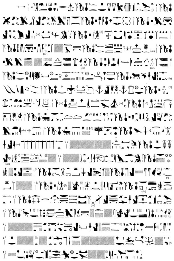 O texto hieroglífico completo do Louvor Matinal para Rá-Hórus ocupa 19 linhas: neste trecho publiquei o texto hieroglífico, a transliteração interlinear e a tradução em inglês das primeiras duas linhas e meia (Edfou VIII, 15, 5-7).