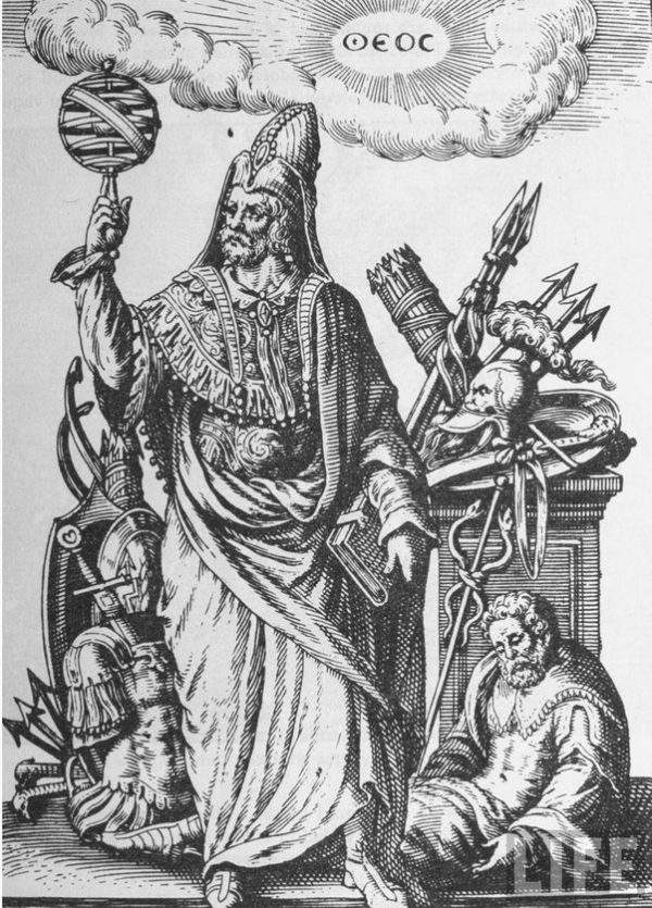 O alquimista árabe Jabir ibn Hayyan retratado aqui, junto com uma representação artística de Hermes Três Vezes Grande .