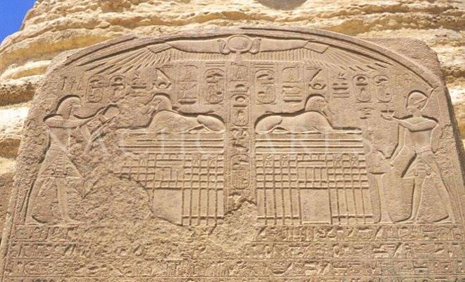 The Dream Stele sits between the paws of the Great Sphinx of Giza and tells the story of the young 18th Dynasty Prince, Tuthmosis, who falls asleep near the ancient monument.